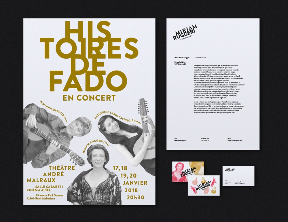 En 2017, la chanteuse Miriam Ruggeri m'a contacté afin que je lui réalise l’ensemble de son identité graphique. Je lui ai crée un logotype ainsi qu’un visuel pour ses cartes de visites. Et également une affiche ainsi qu'une newsletter promotionelle pour son groupe Histoires de Fado. Chacun des visuels a été concu à partir d’une série de portraits photographiques que le groupe